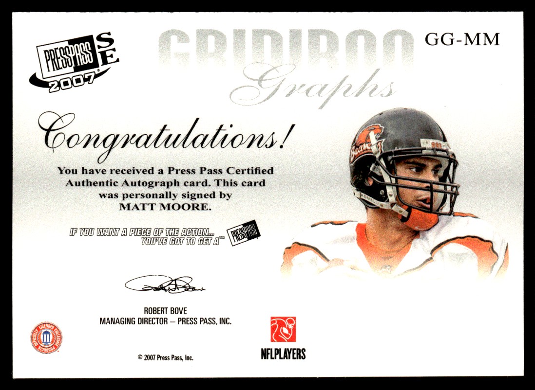 Graded:No Sport:Football Player/Athlete:Matt Moore officiel Features:Autograph Set:Press Pass SE Gridiron Graphs Gold Team:Oregon State Beavers Card Name:2007 Press Pass SE Gridiron Graphs Gold Matt Moore Auto Oregon St Card Number:GG-MM Type:Sports Trading Card Signed By:Matt Moore Year Manufactured:2007 Season:2007 Card Size:3½ x 2½""Original/Licensed Reprint:Original Autographed:Yes Vintage:No Game:Unspecified Character:Matt Moore Franchise:Football.
